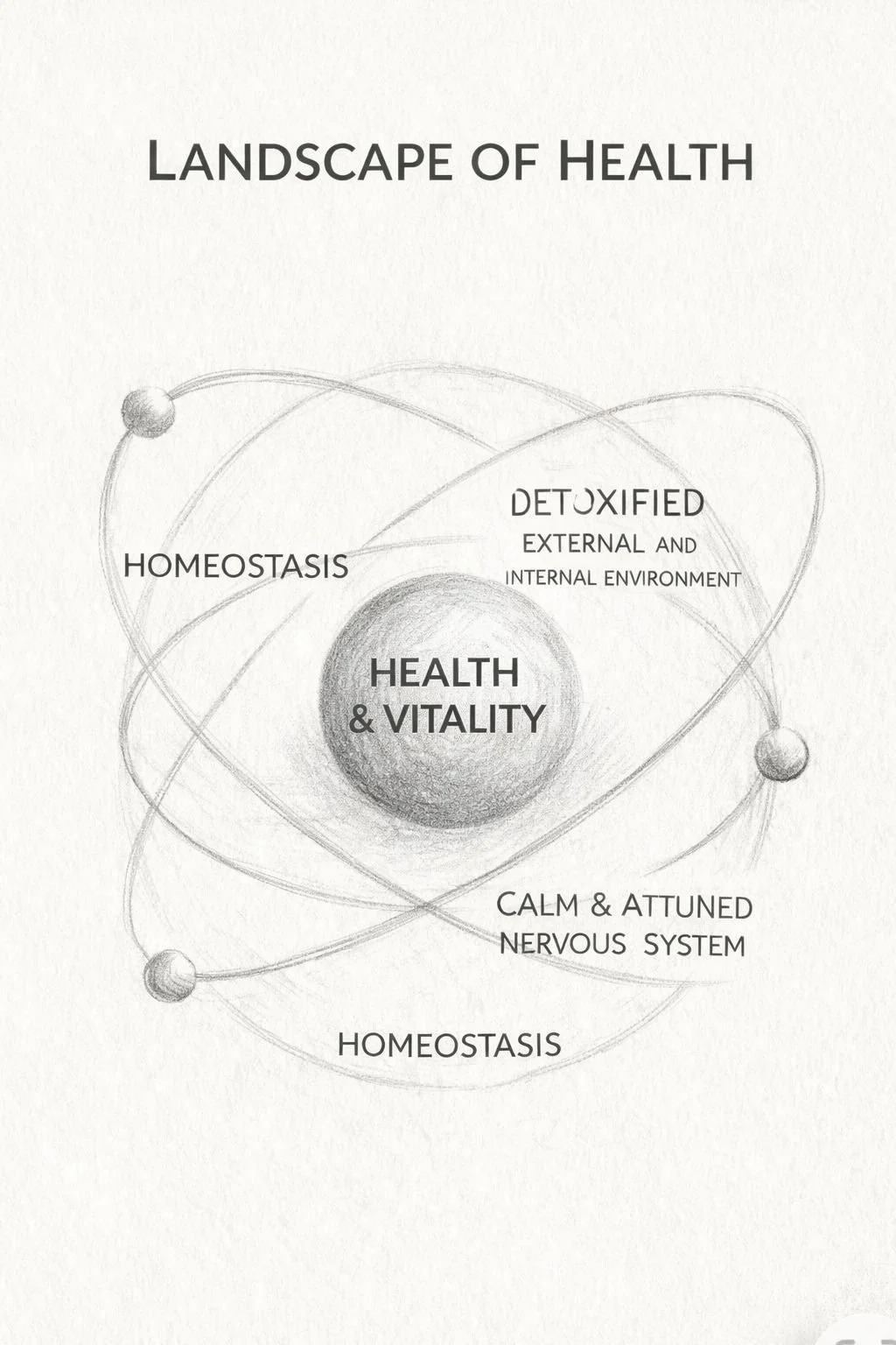 The REgenerative HUman approach can be imagined as three outer orbits of conditions that progress towards an internal nucleus of Vitality. At the outermost orbit is an environment, both internal (inside the body) and external (outside the body), that is detoxified from physical and metaphysical toxins. The next orbit is a calm and attuned nervous system, and the following orbit within is a state of homeostasis. Nestled at the center of these three conditions, is health and vitality. How we do life- the choices we make, the beliefs we carry, the love we hold for ourselves and others- are the most effective ways we can support the body’s natural desire and capacity to heal, grow, recover and thrive.